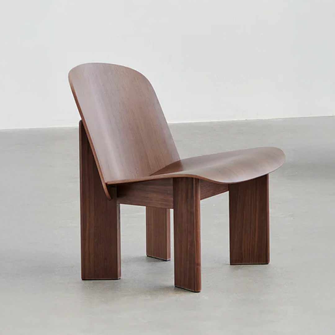 La silla Chisel Lounge tiene respaldo y asiento moldeado en contraenchapado en walnut (WWL ) con base de 4 patas de madera.